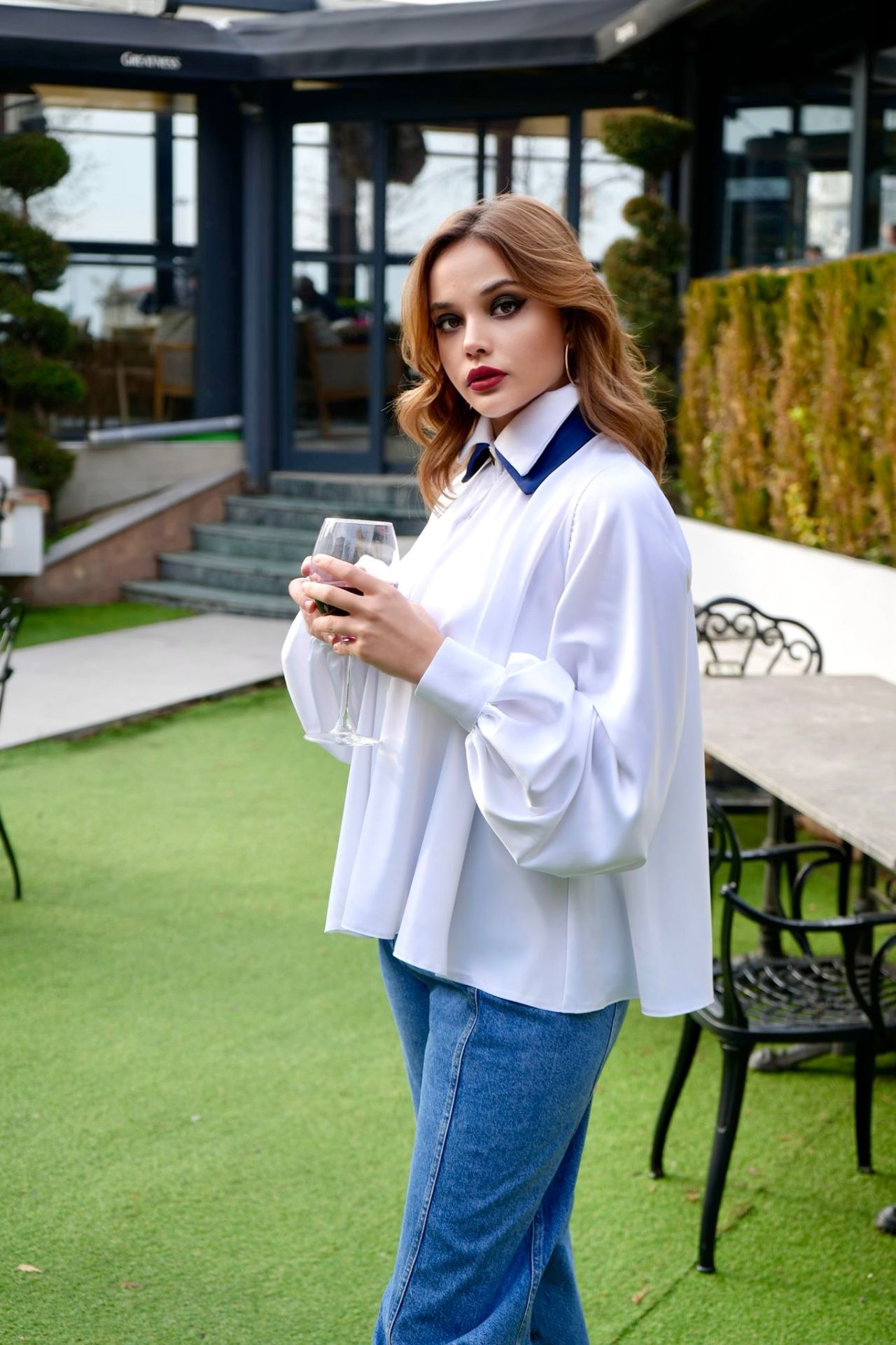 Lacivert Yaka Detaylı Çift Yaka Volanlı Beyaz Saten Gömlek