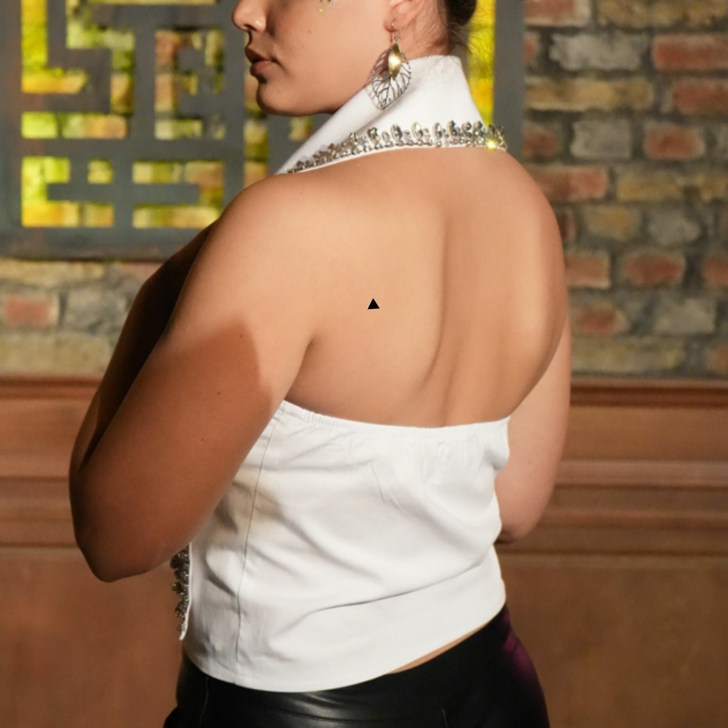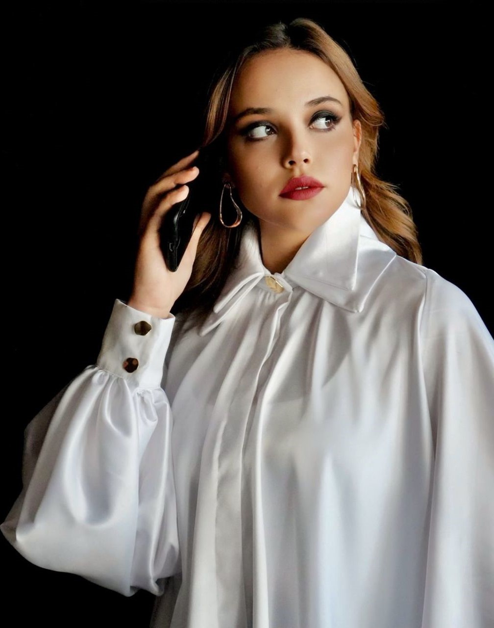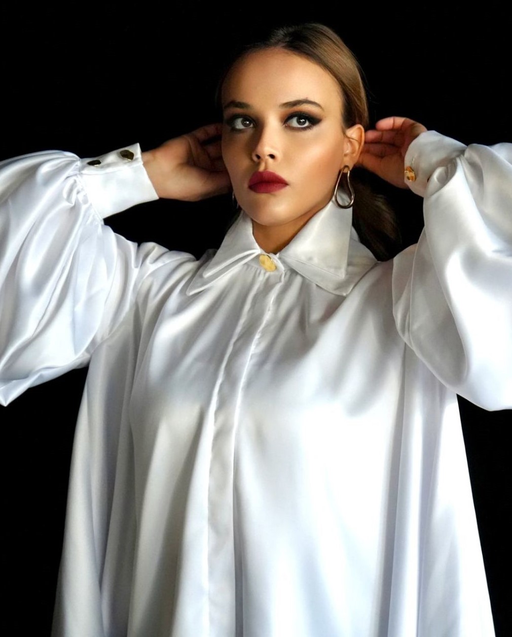 Ürün beyaz saten kumaştan çift yaka detayı kullanılarak S/M ve M/L beden olarak üretilmiştir.