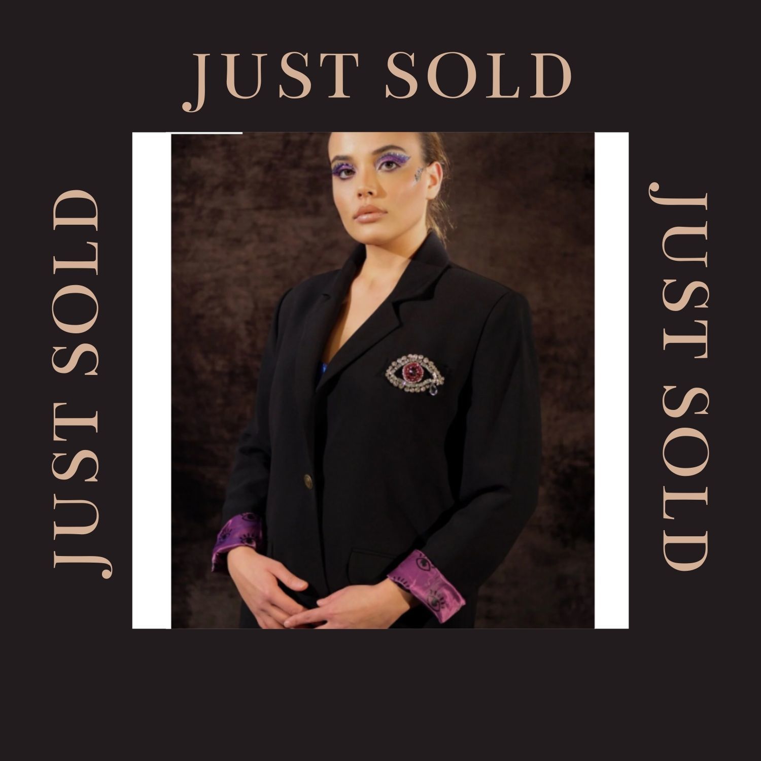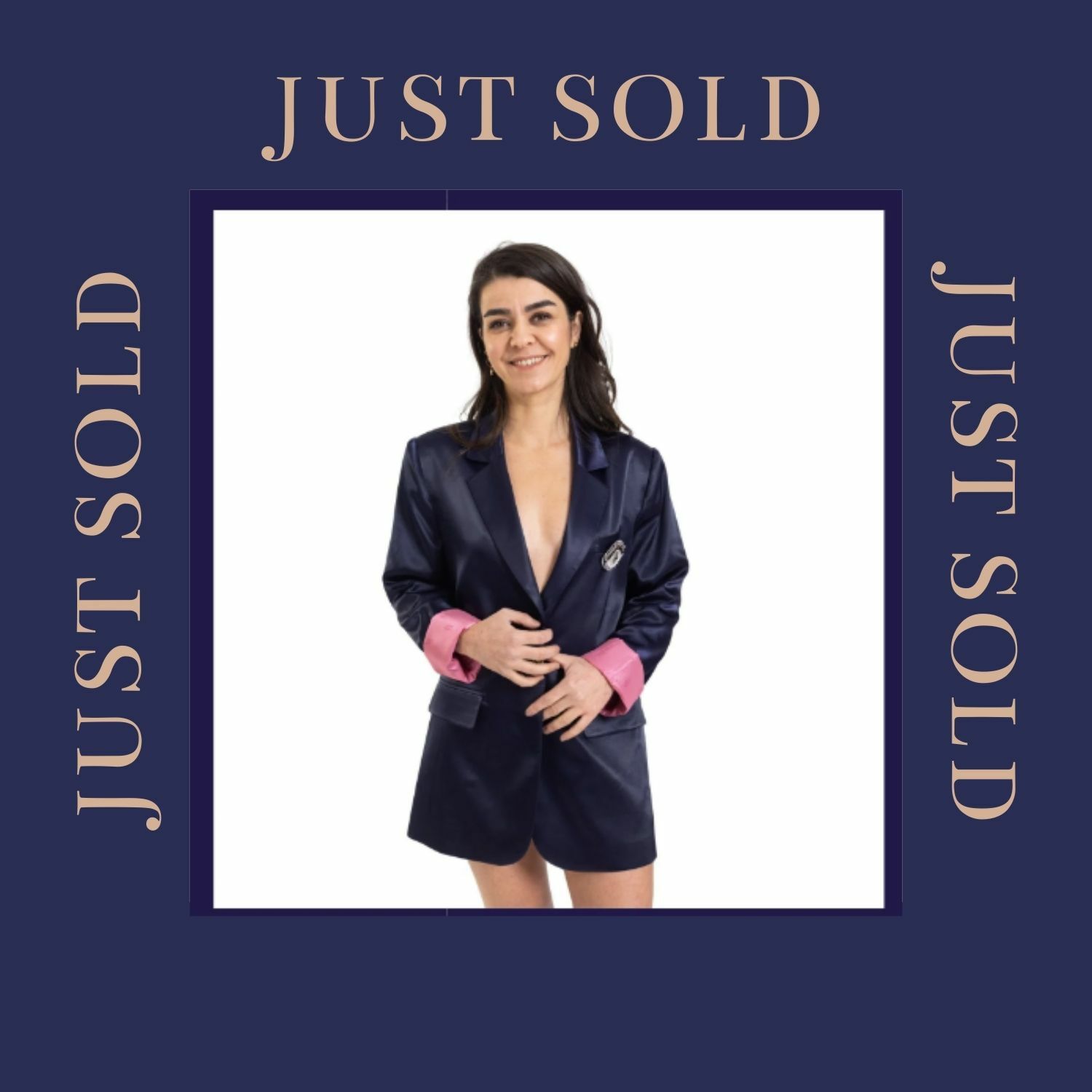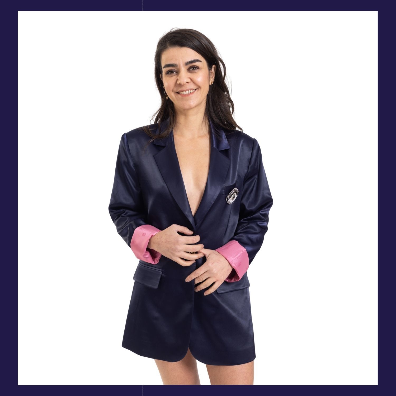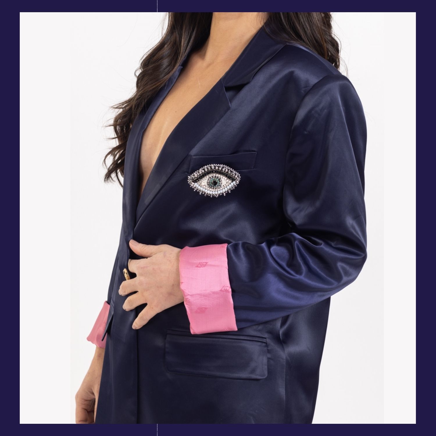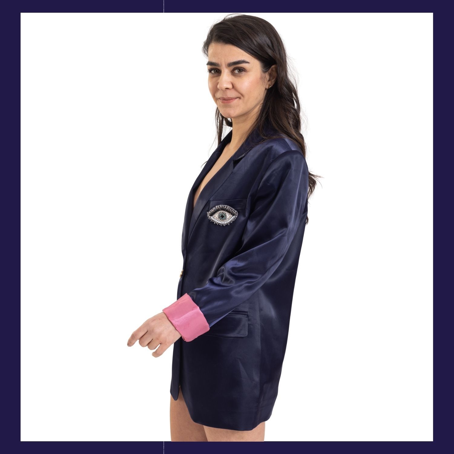 Lacivert Kristal Göz Detaylı Pembe Astarlı Saten Ceket