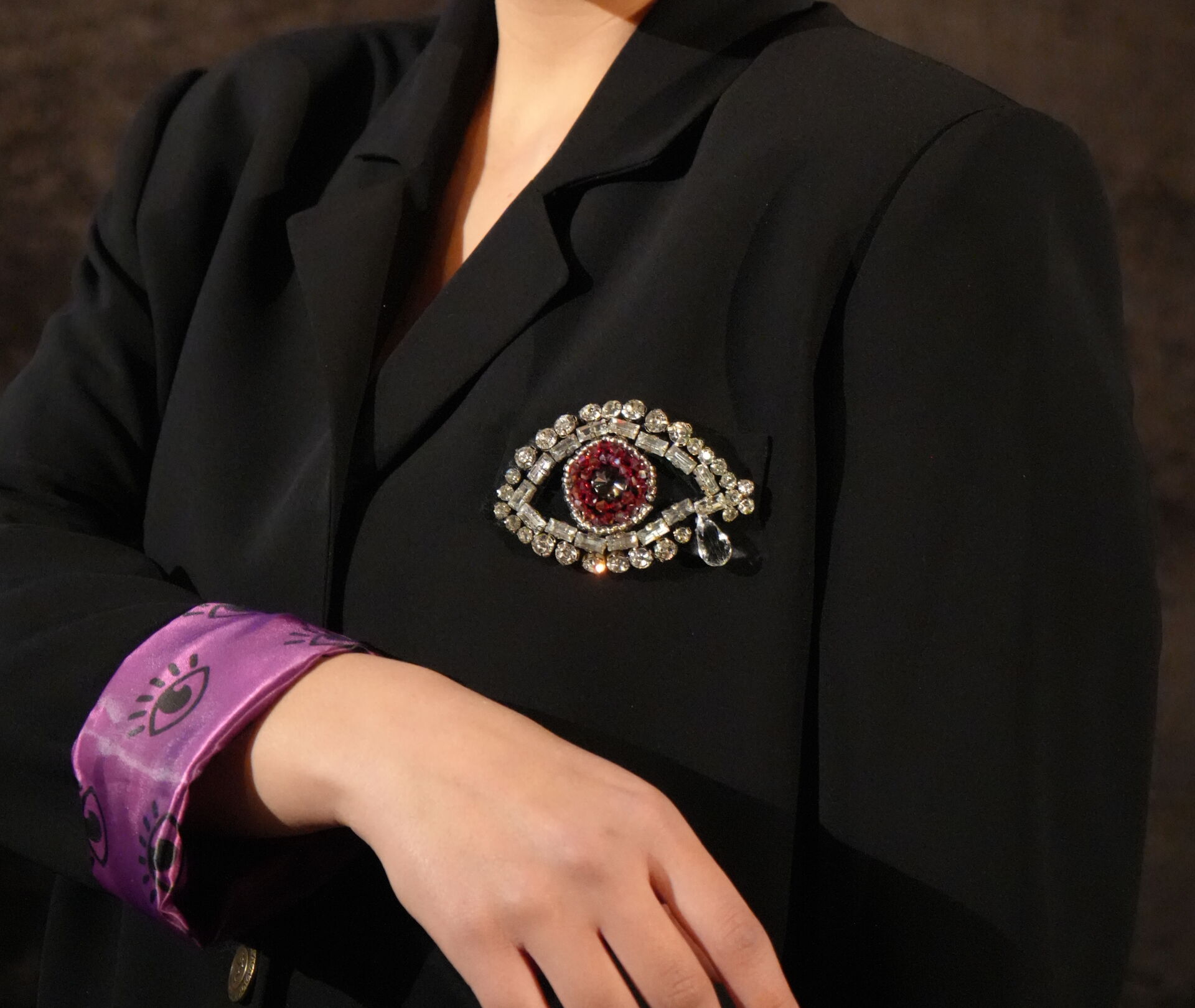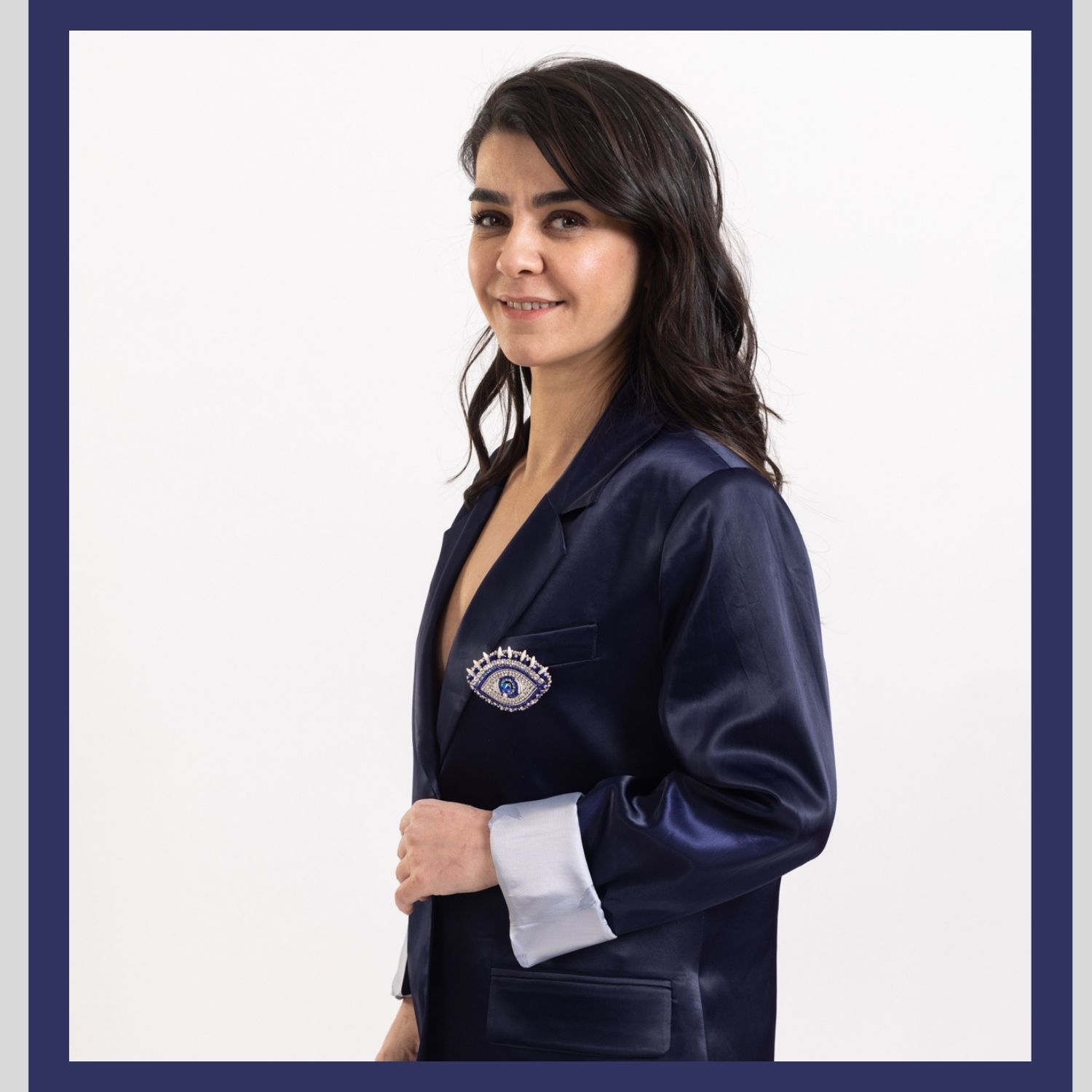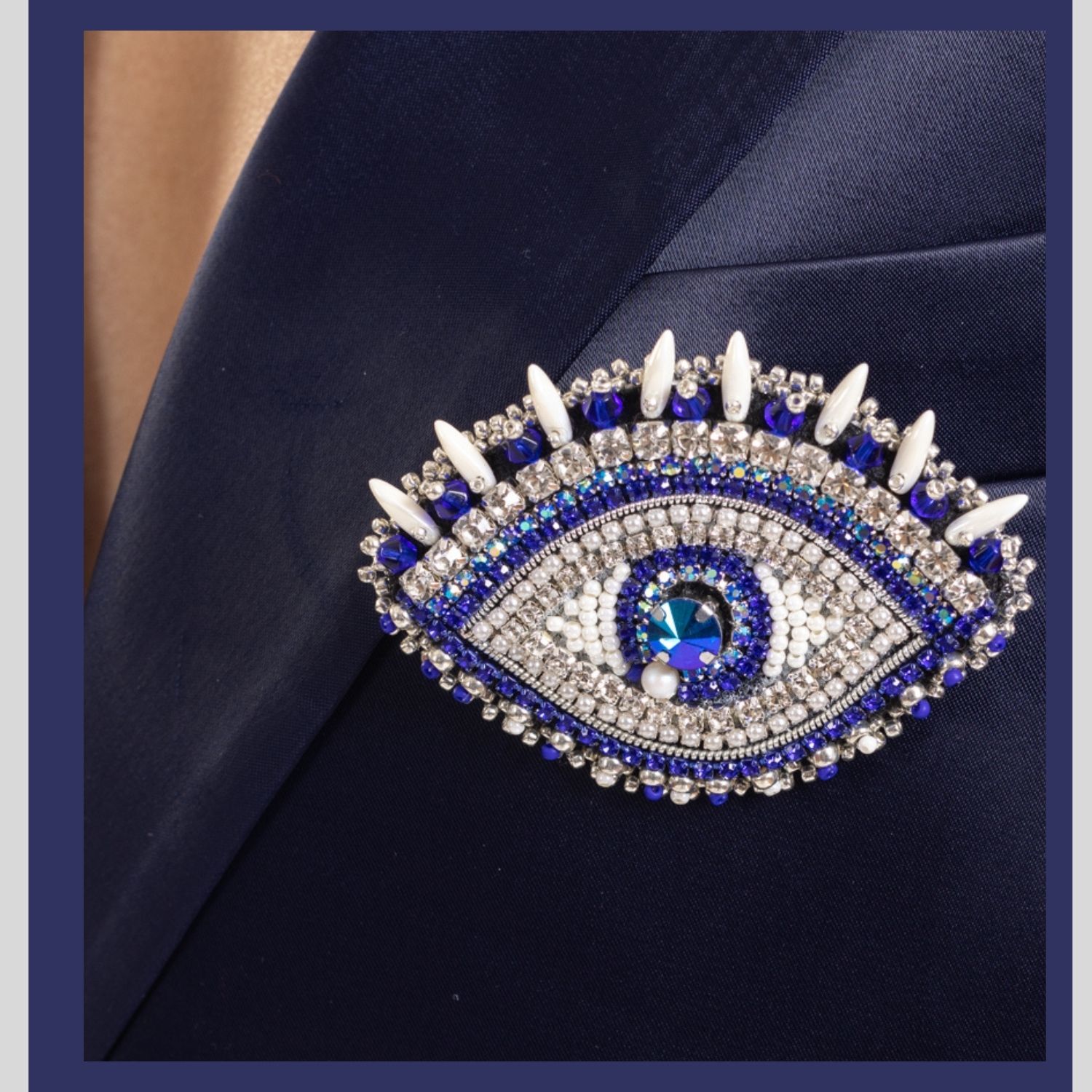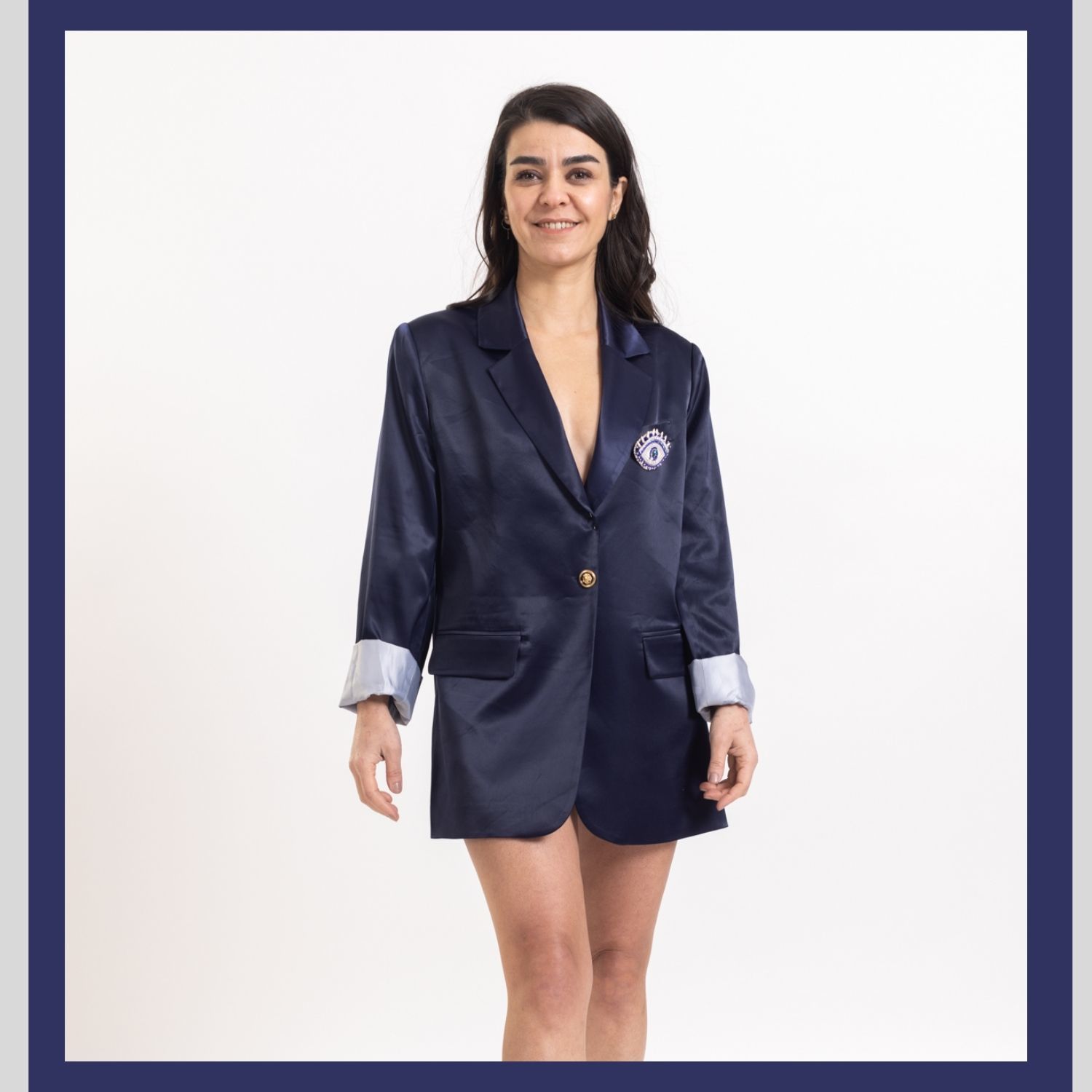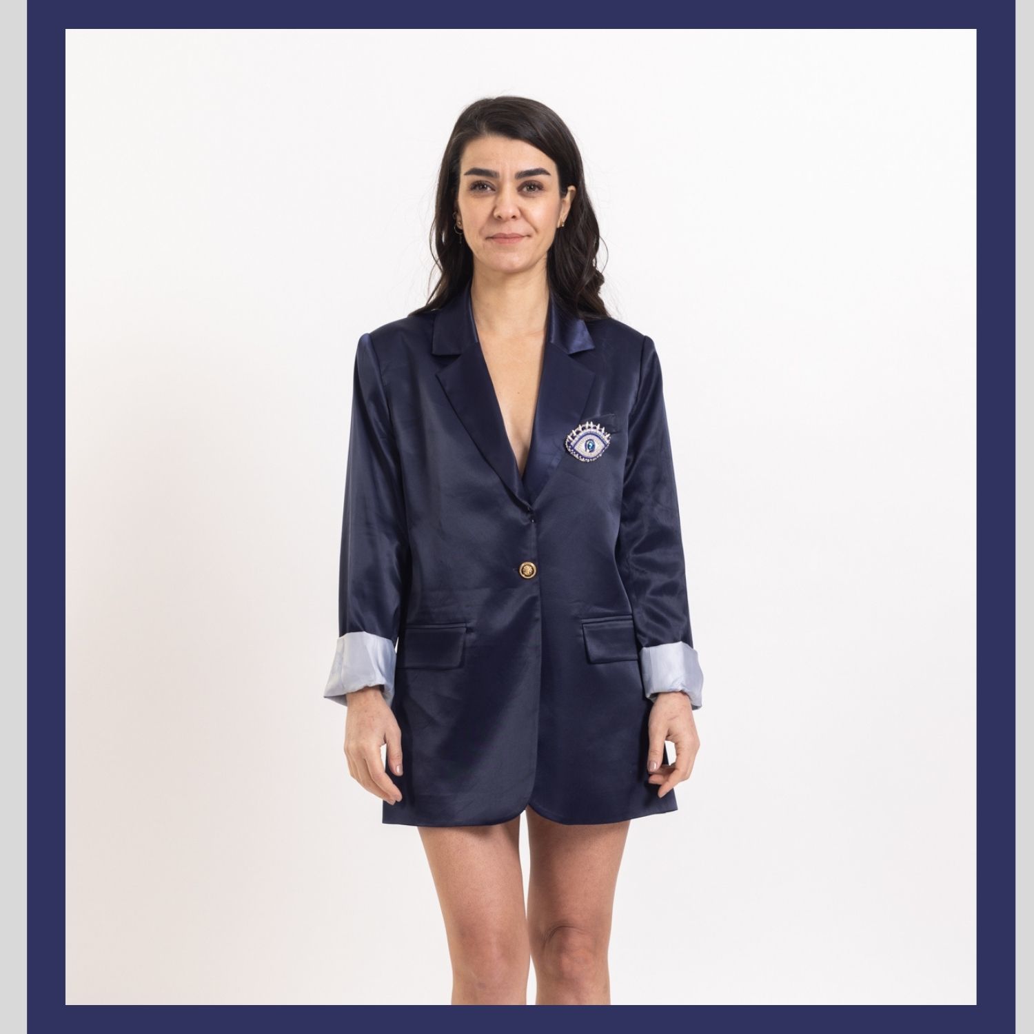 Lacivert Kristal Göz Detaylı Gri Astarlı Saten Ceket