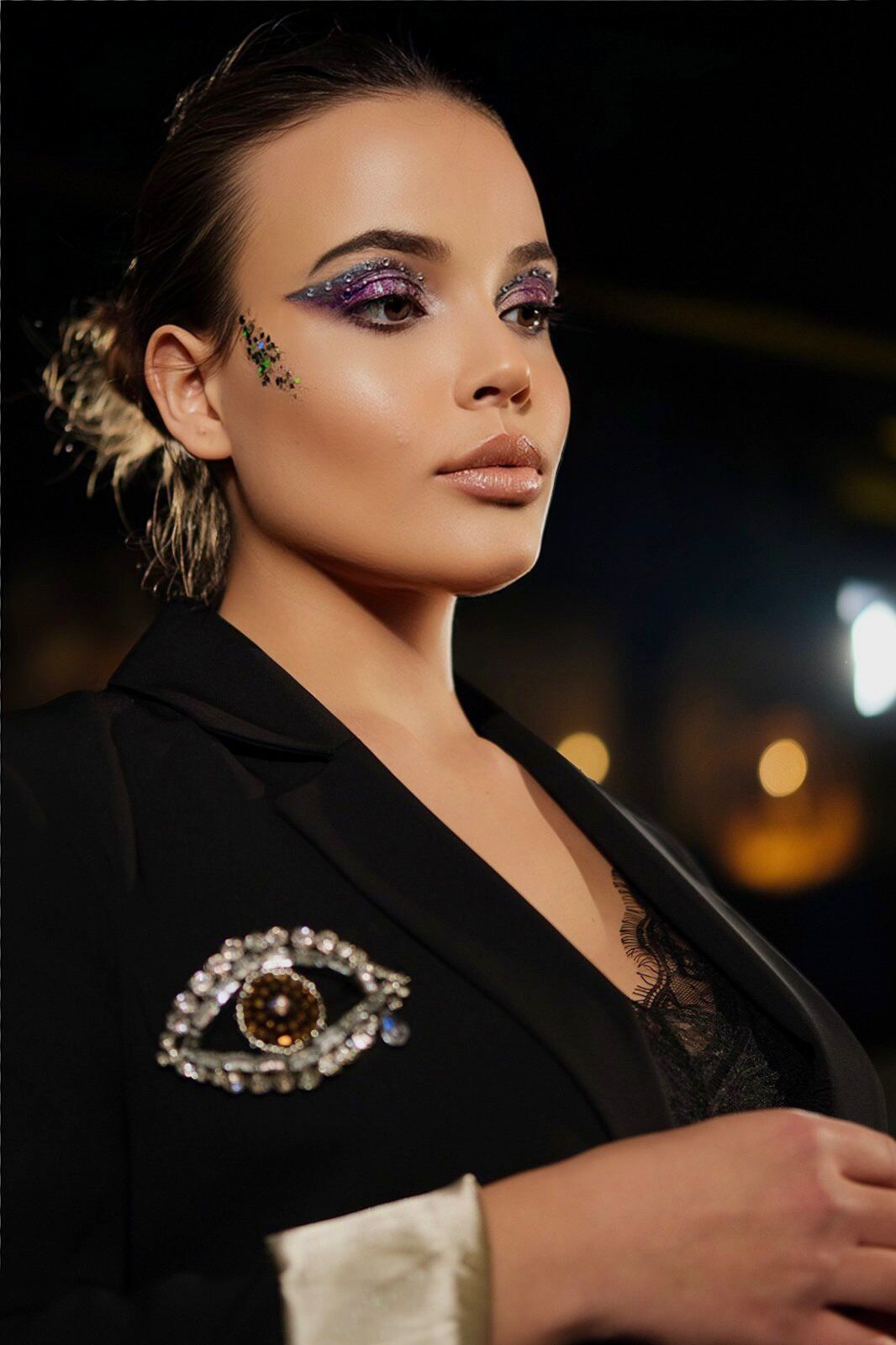 Crystal Edition Mor Kol Detaylı Siyah Saten Ceket