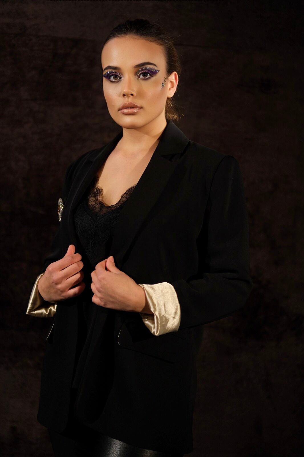 Crystal Edition Krem Rengi Kol Detaylı Siyah Saten Ceket