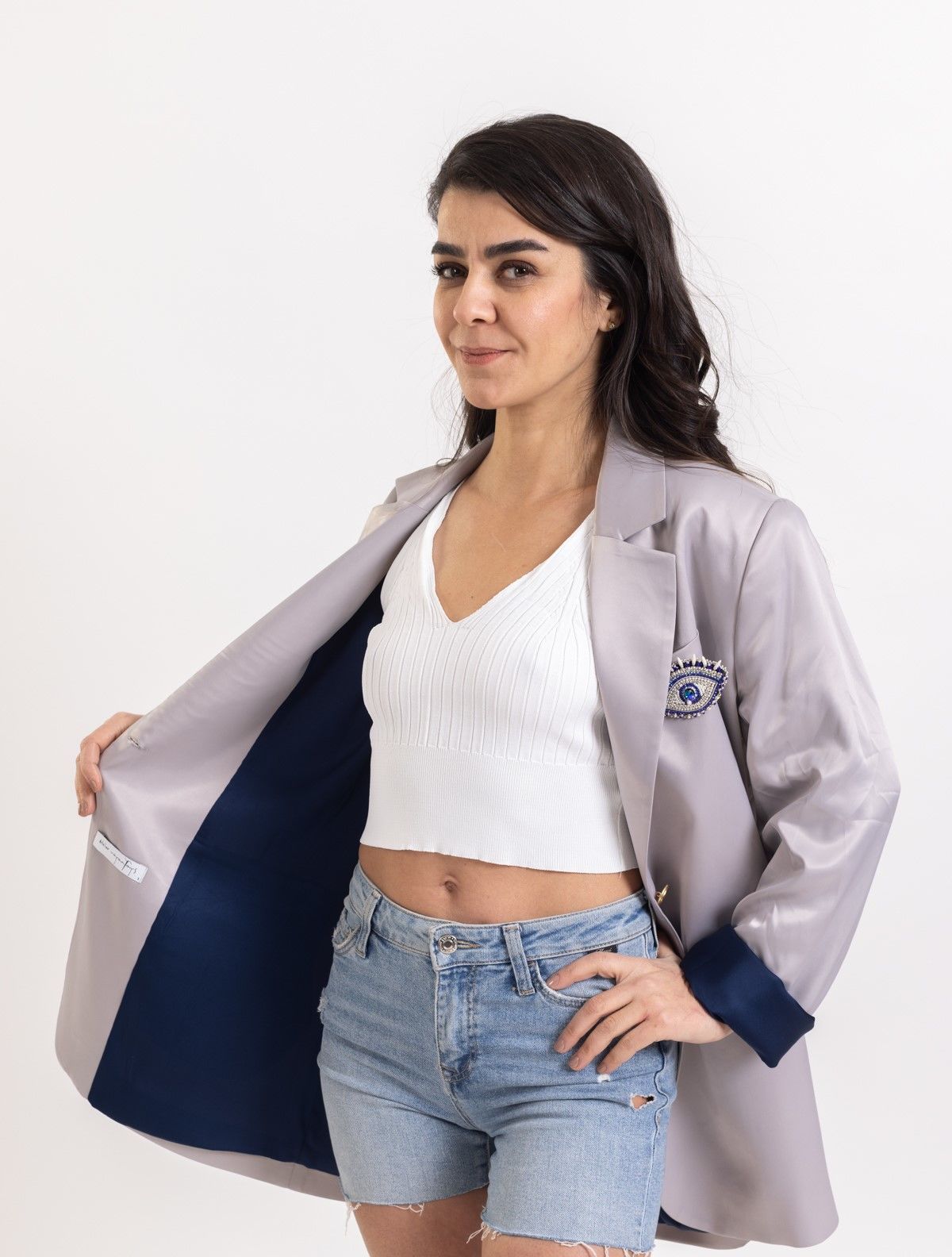 Gri Kristal Göz Detaylı Lacivert Astarlı Saten Ceket