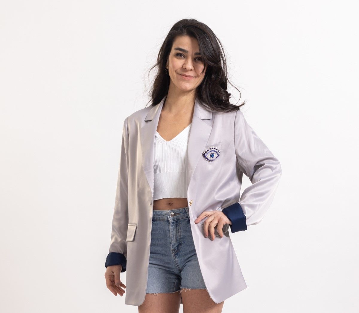 Ürün lacivert ipek saten astar ve gri ipek saten kumaş kullanılarak S, M ve L beden olarak üretilmiştir.